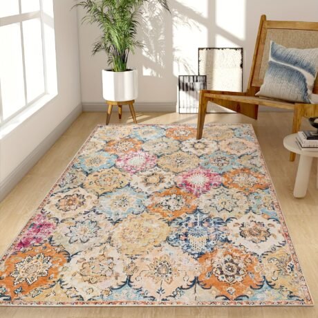 Luxurious Tribal Washable Rug – Large Boho Area Rug for Living Room, Non-Slip, Vintage Soft, Distressed Design, Indoor Floor Carpet for Bedroom, Bathroom, Kitchen – Easy to Clean, Durable, and Pet-Friendly
