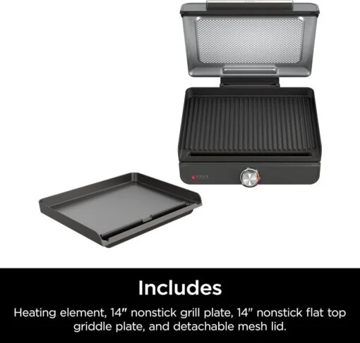 - WHAT’S INCLUDED: Ninja Sizzle Indoor Grill & Griddle, 14’’ Nonstick Grill Plate, 14’’ Nonstick Flat-Top Griddle Plate, & Quick Start Guide with 10 Recipes.