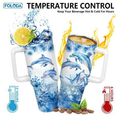 1pc Adorable Blue Dolphin Stainless Steel Insulated Tumbler – 40oz Capacity, Handle, Lid, Straw, Durable, Leak-Proof, Keeps Drinks Hotu002FCold – Perfect Valentine’s Day, Birthday Gift for Wife, Mom, Daughter, Mama, Sister, Grandma, Ideal for Outdoor Camping, Hiking, Travel